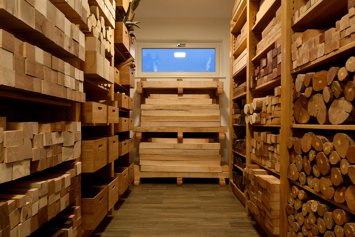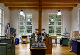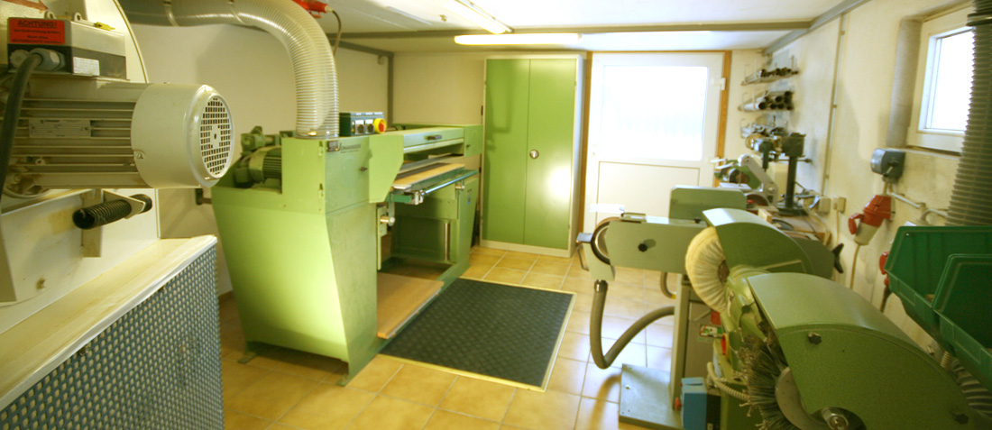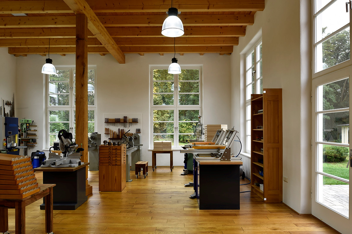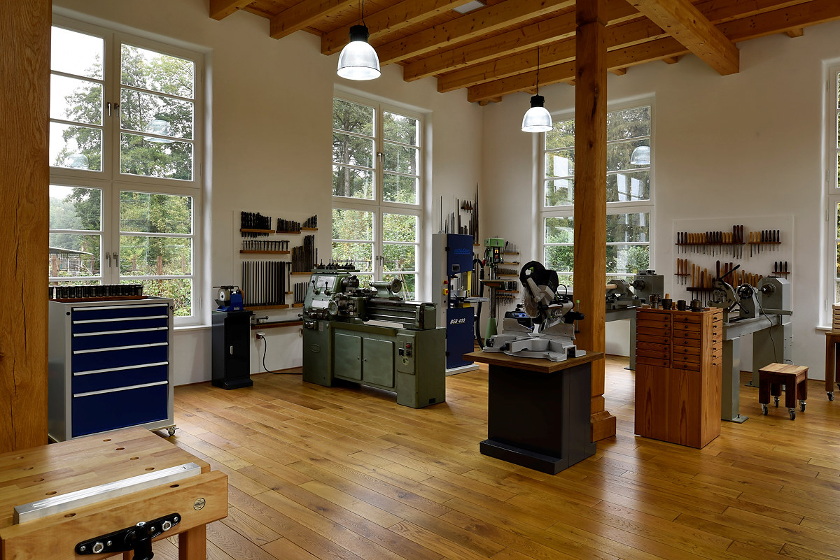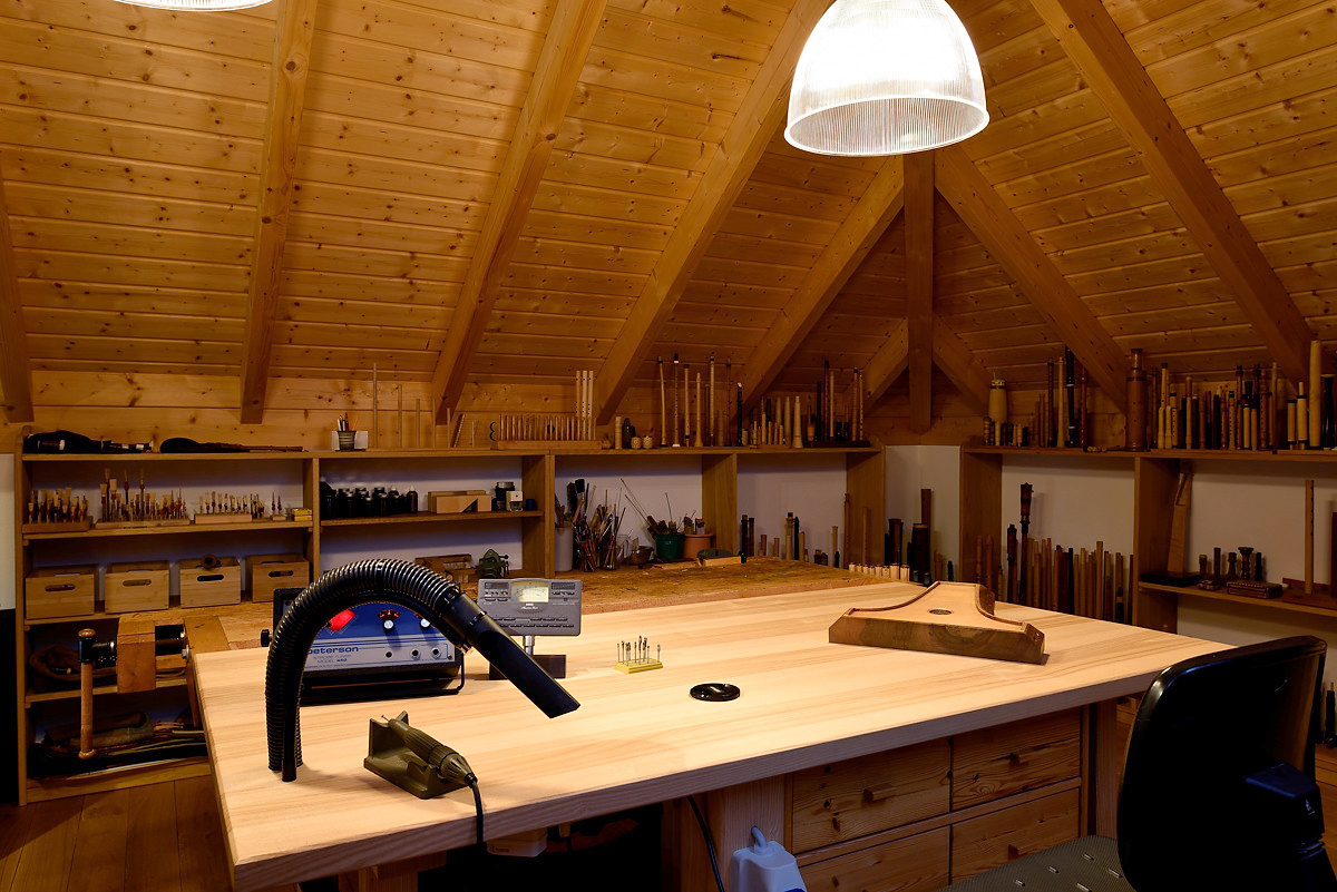 Die Werkstatt des Musikinstrumentenbauers Andreas Spindler erstreckt sich über mehrere lichtdurchflutete Räume und Stockwerke, so dass Maschinenarbeit wie das Drehen und Drechseln in einer anderen Umgebung erfolgen kann, als die Oberflächenbehandlung der Instrumente. |
